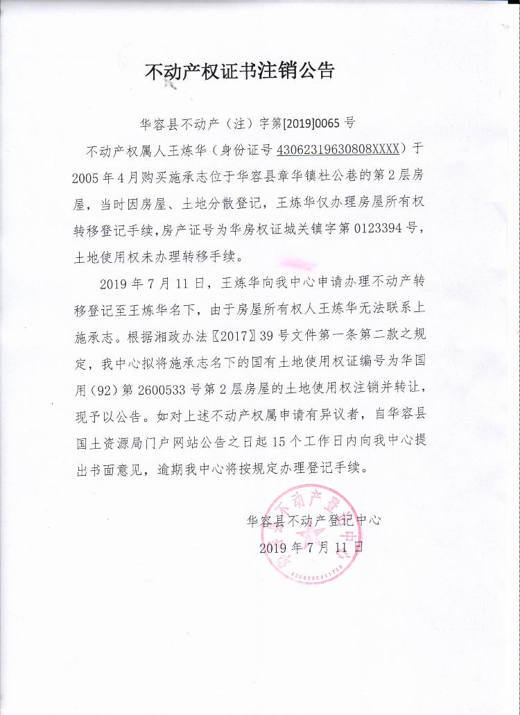不动产权证书注销公告【土地使用权证(施承志转王炼华)】
