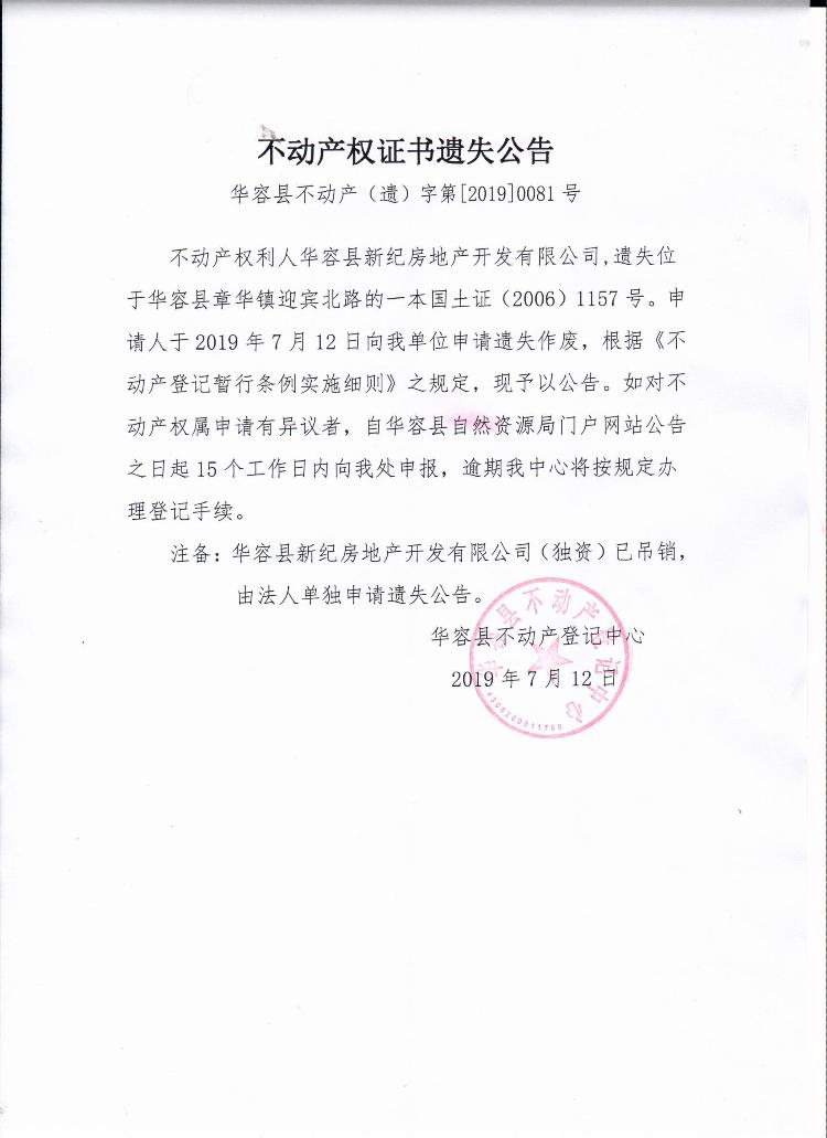 不动产权证书遗失公告【国土证(华容县新纪房地产开发有限公司)】