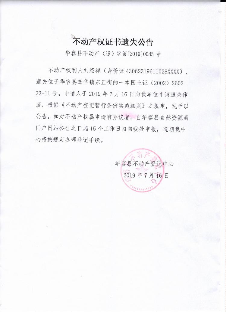 不动产权证书遗失公告【国土证(刘绍祥)】