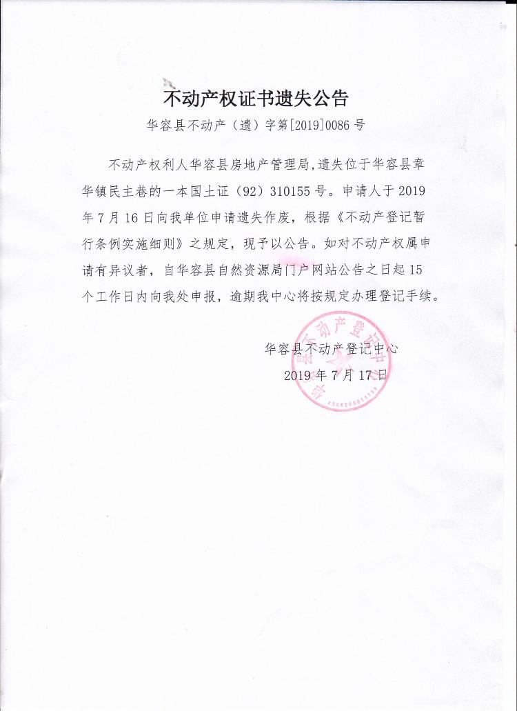 不动产权证书遗失公告【国土证(华容县房地产管理局)第四宗】