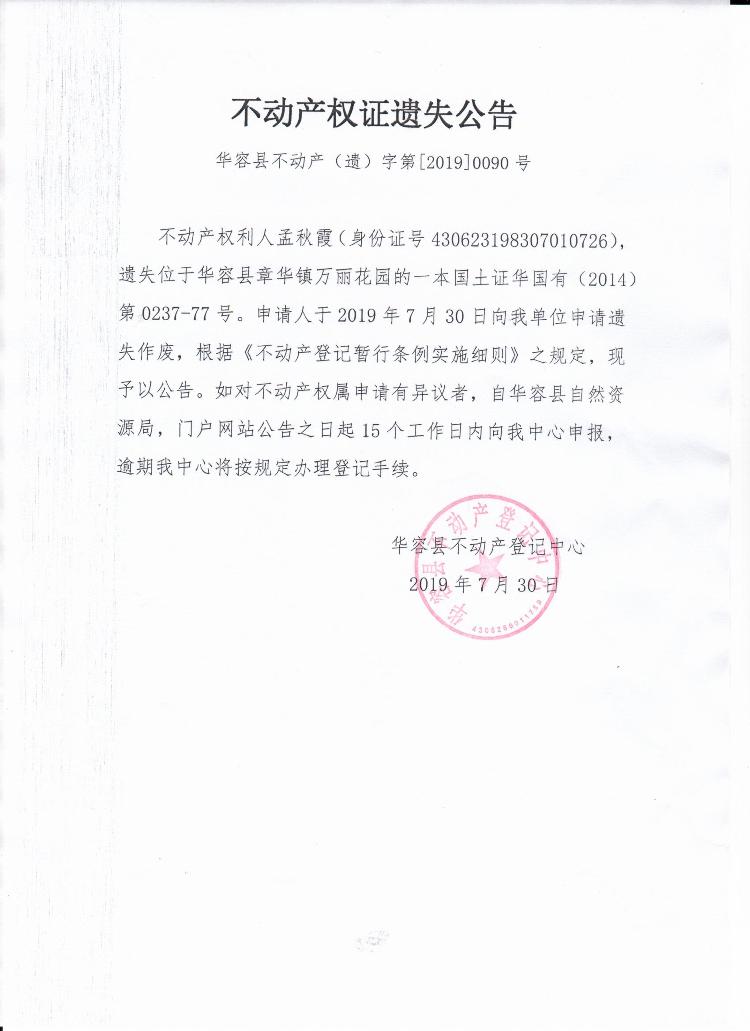 不动产权证书遗失公告【国土证(孟秋霞)】