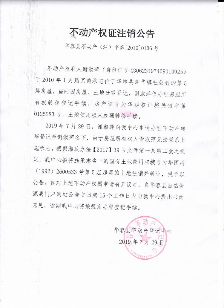 不动产权证书注销公告【土地使用权证(施承志转谢淑萍)】