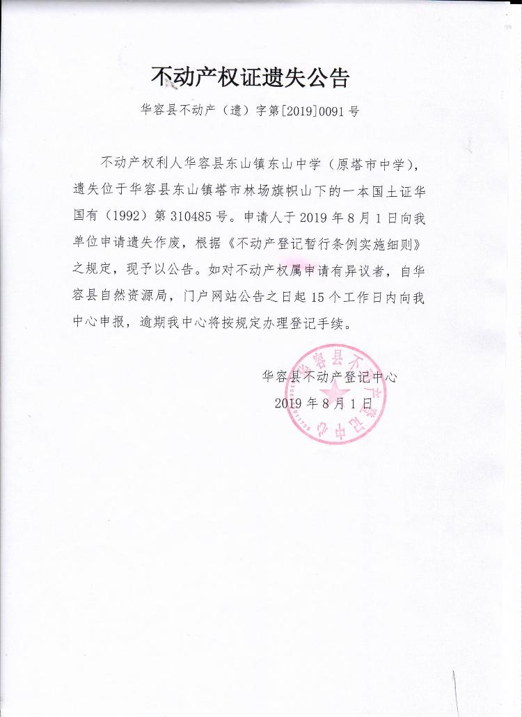 不动产权证书遗失公告【国土证(华容县东山镇东山中学)】