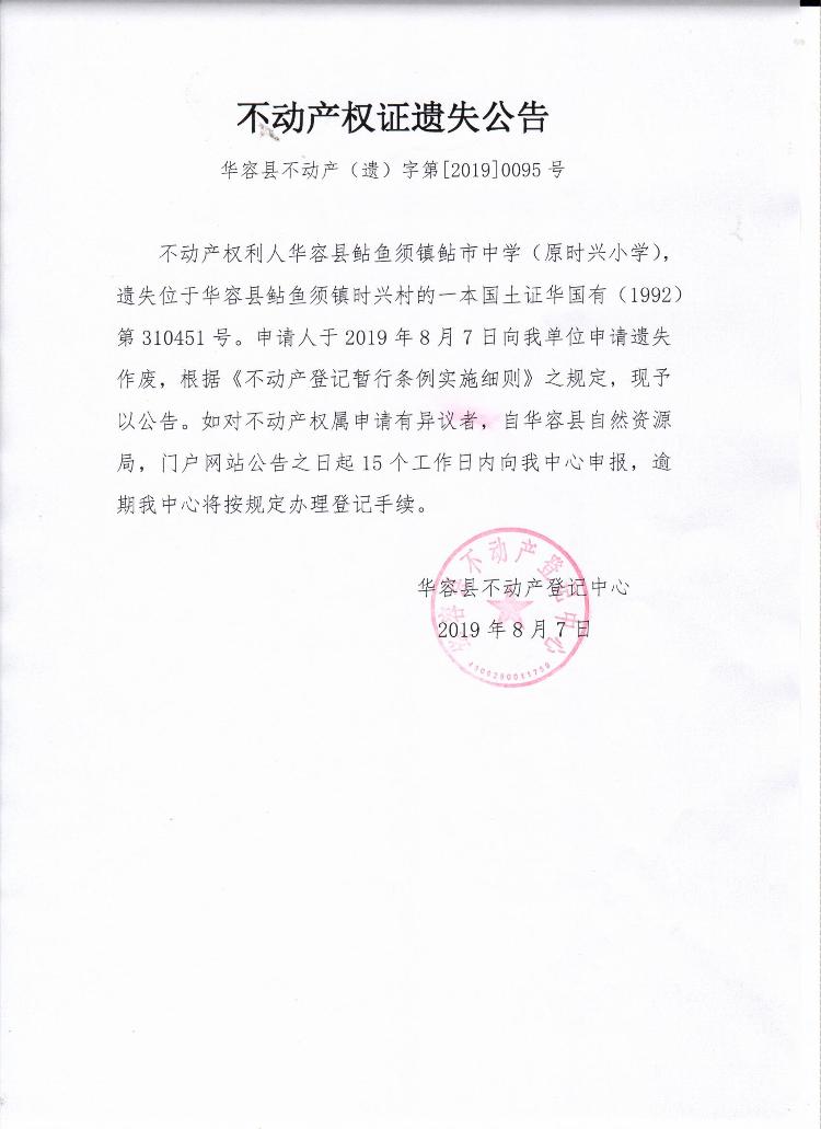 不动产权证书遗失公告【国土证(华容县鲇鱼须镇鲇市中学)】