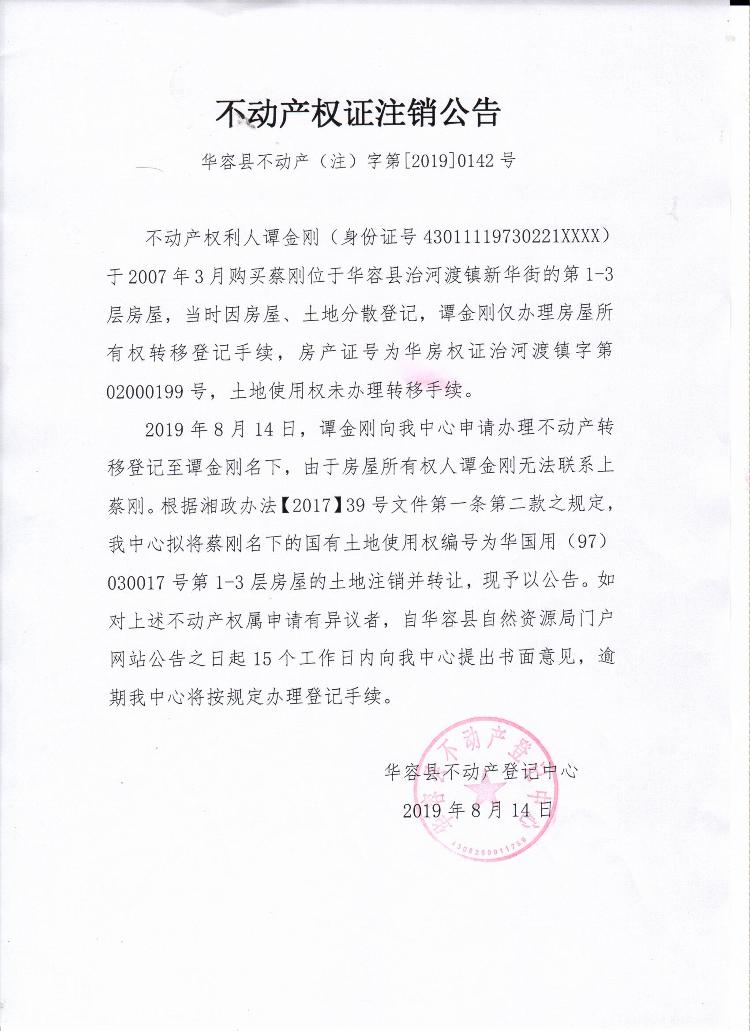 不动产权证书注销公告【土地使用权证(蔡刚转谭金刚)】