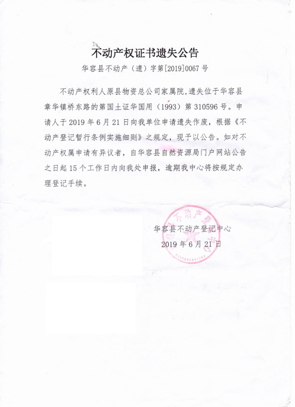 不动产权证书遗失公告【国土证(原县物资总公司家属院)】