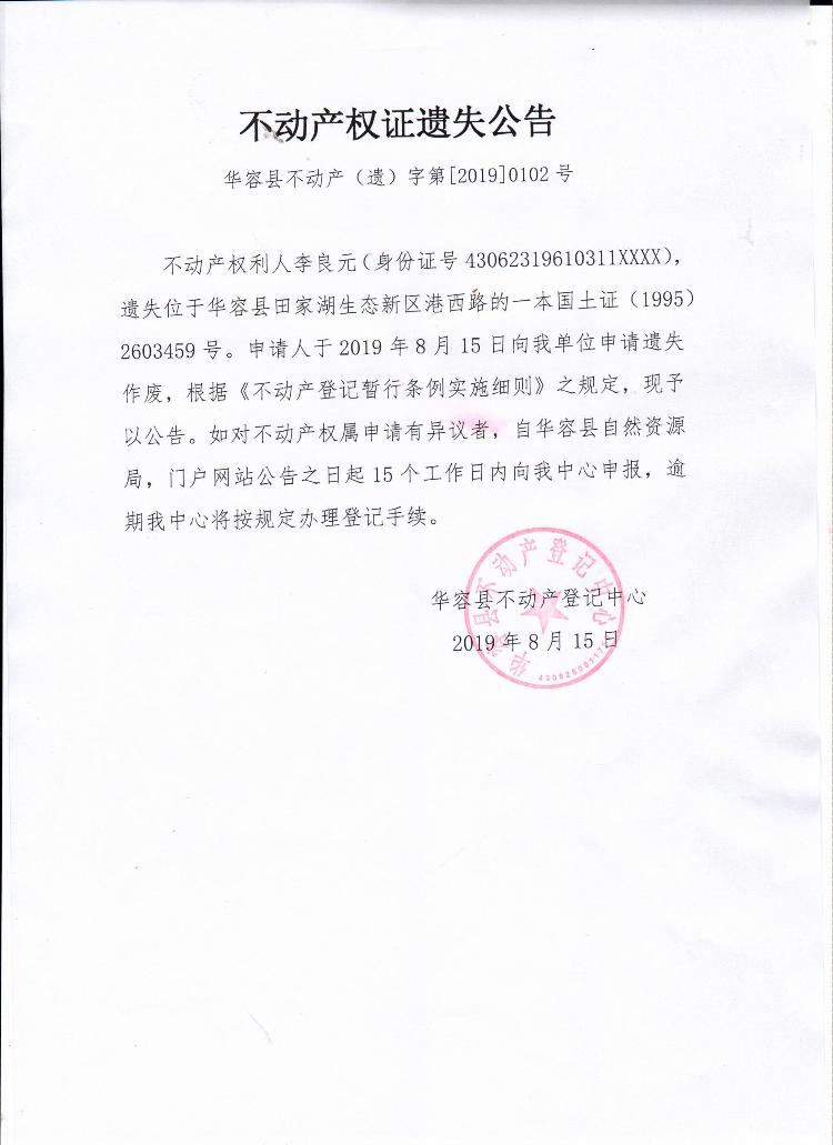 不动产权证书遗失公告【国土证(李良元)】