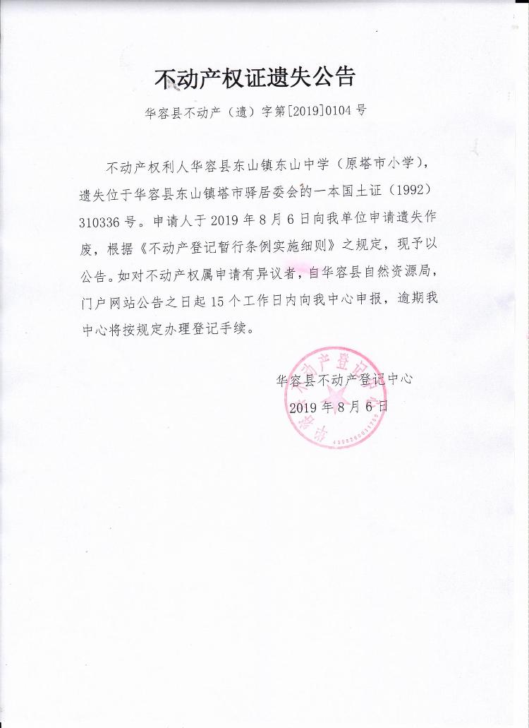 不动产权证书遗失公告【国土证(华容县东山镇东山中学)原塔市小学】