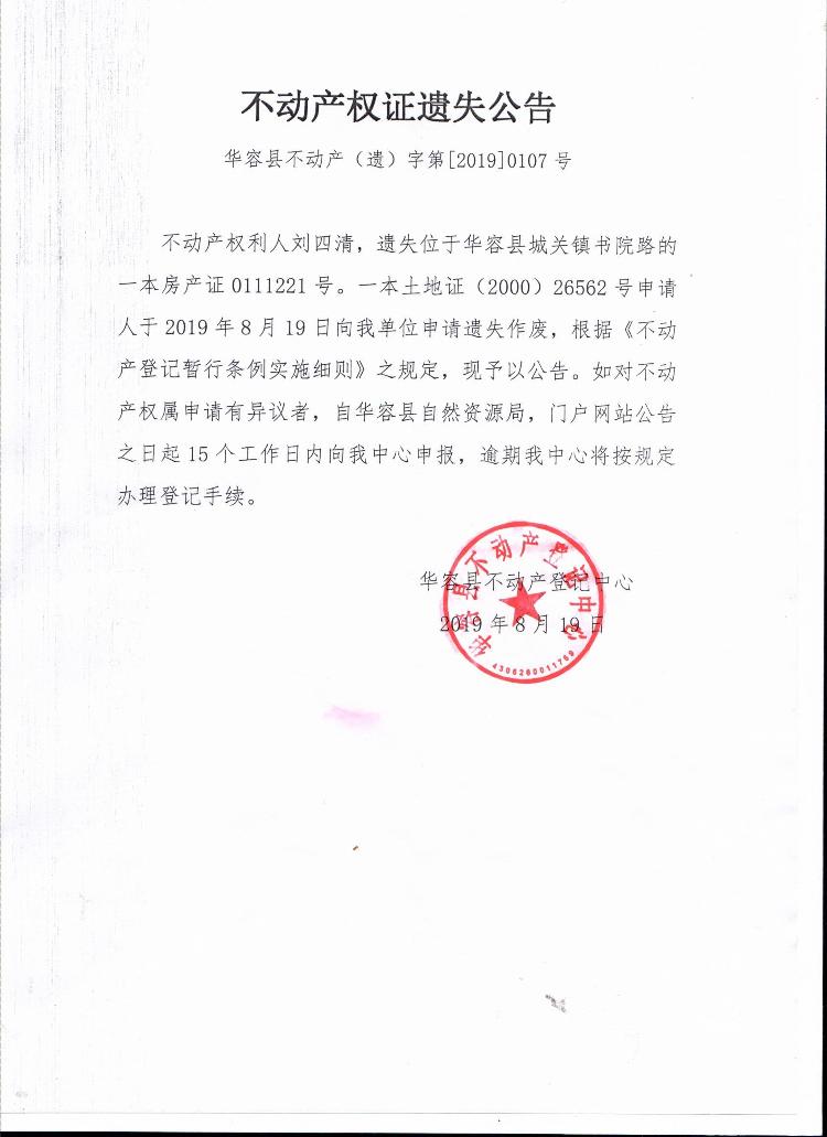 不动产权证书遗失公告【房产证 土地证(刘四清)】