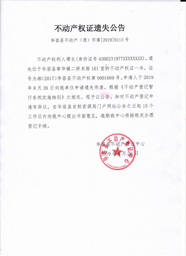 不动产权证书遗失公告【不动产权证(谭长)】