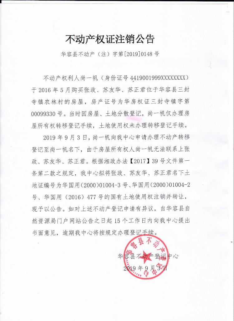 不动产权证书注销公告【土地使用权证(张政、苏友华、苏正君转尚一帆)】