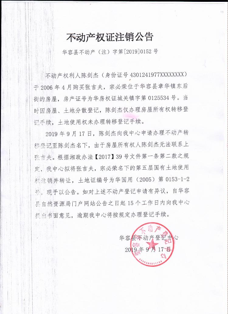 不动产权证书注销公告【土地使用权证(张吉夫 宗必荣转陈剑杰)】