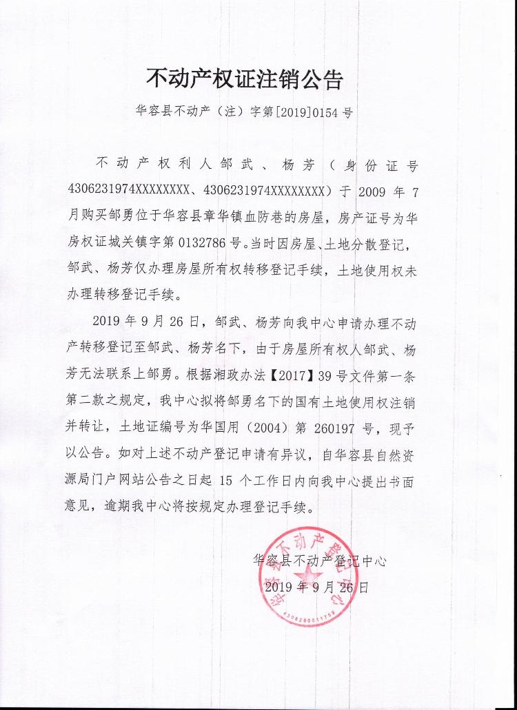 不动产权证书注销公告【土地使用权证(邹勇转邹武 杨芳)】