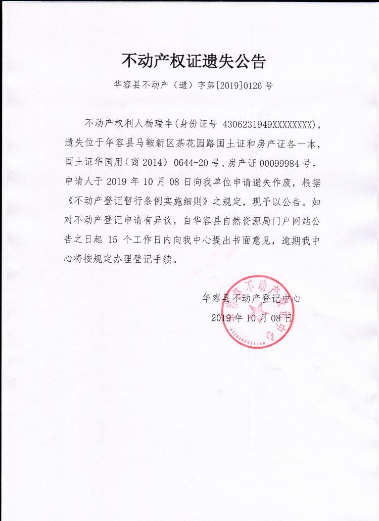 不动产权证遗失公告【国土证 房产证(杨瑞丰)】