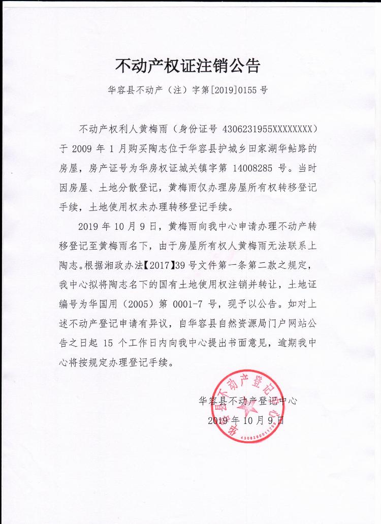 不动产权证书注销公告【土地使用权证(陶志转黄梅雨)】
