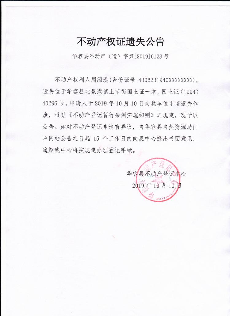 不动产权证遗失公告【国土证(周绍溪)】