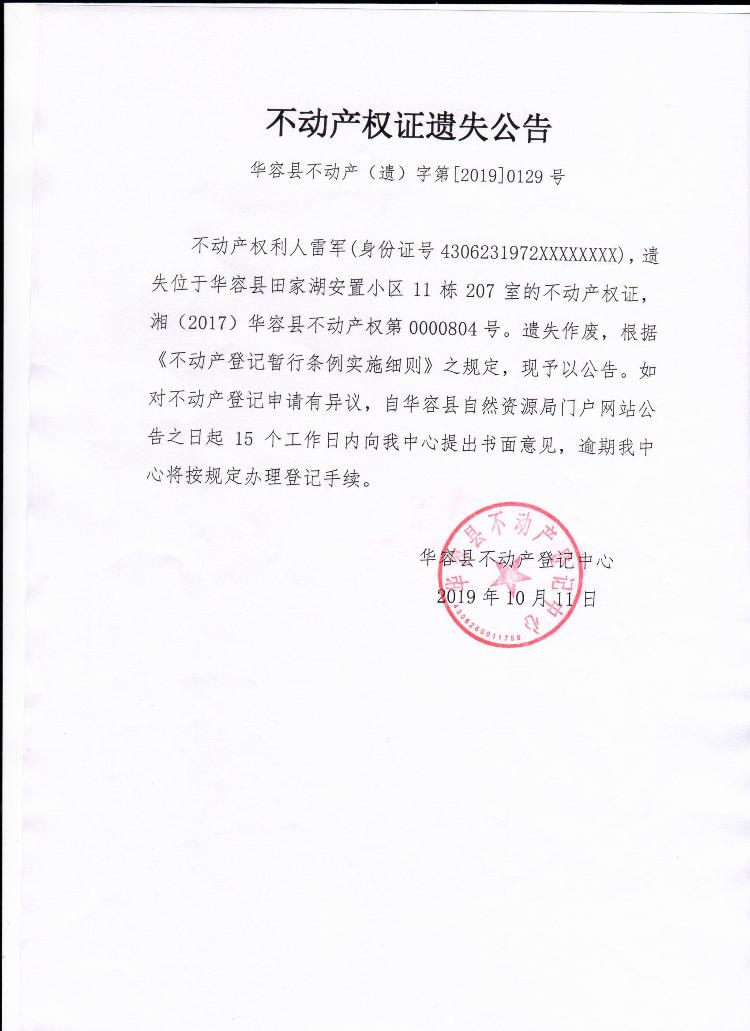 不动产权证遗失公告【不动产权证(雷军)】