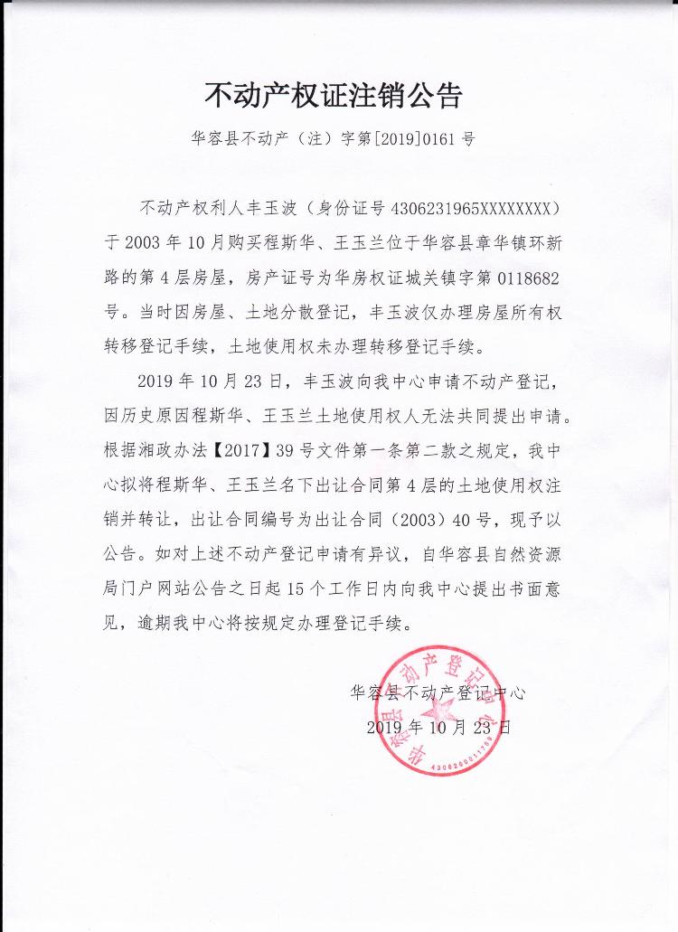 不动产权证书注销公告【土地使用权证(程斯华、白玉兰转丰玉波)】