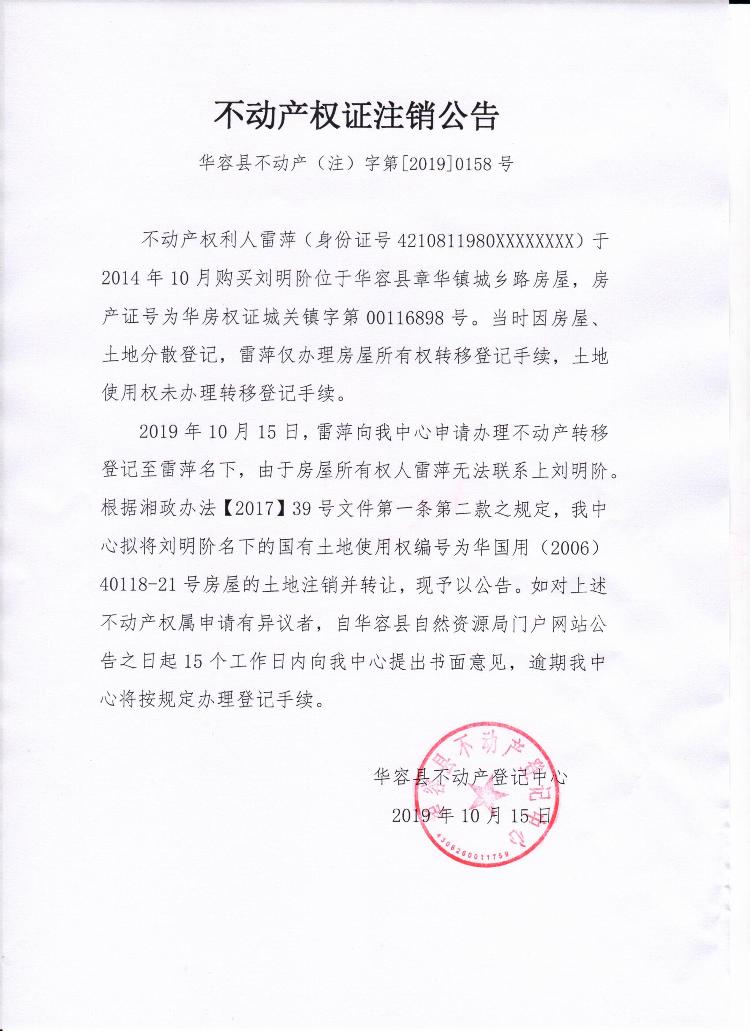 不动产权证书注销公告【土地使用权证(刘明阶转雷萍)】