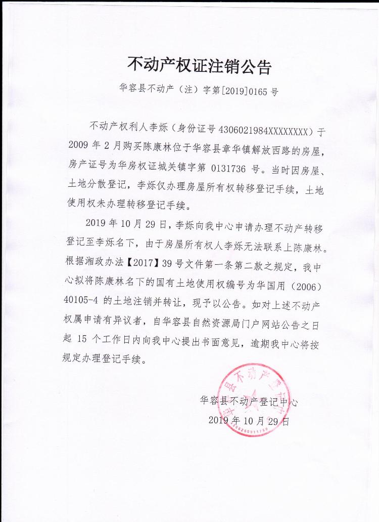 不动产权证书注销公告【土地使用权证(陈康林转李烁)】