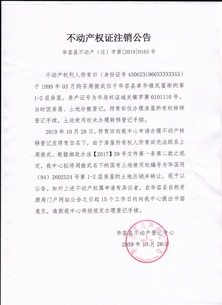 不动产权证书注销公告【土地使用权证(周振武转符育田)】