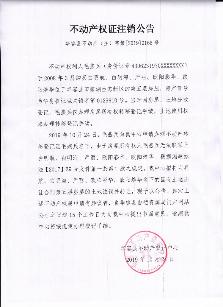 不动产权证书注销公告【土地使用权证(白民航等户转毛燕兵)】
