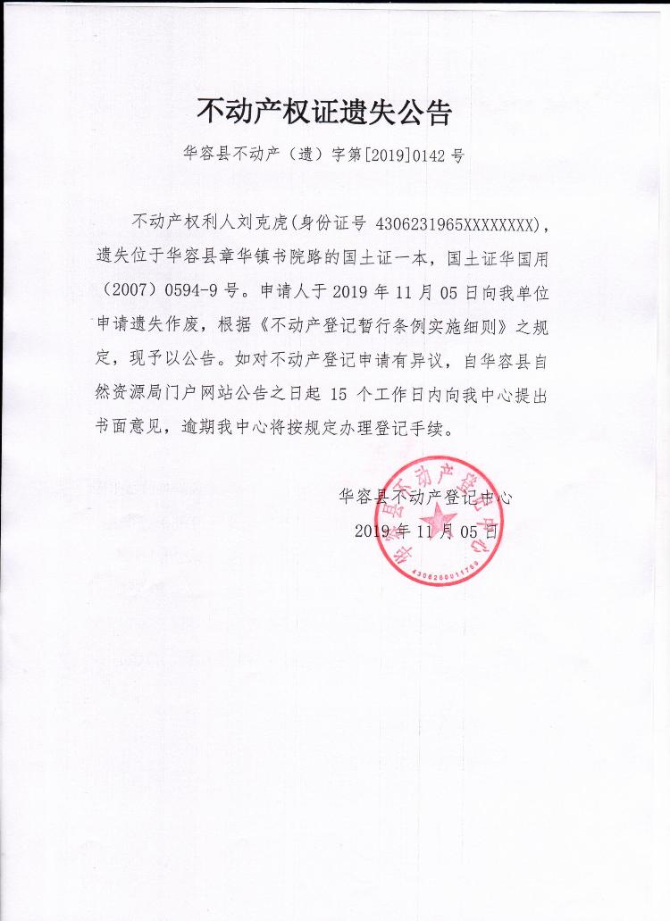 不动产权证遗失公告【国土证(刘克虎)】