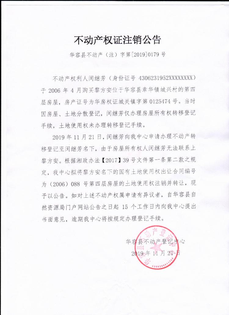 不动产权证书注销公告【土地使用权证(黎方安转闵继芳)】