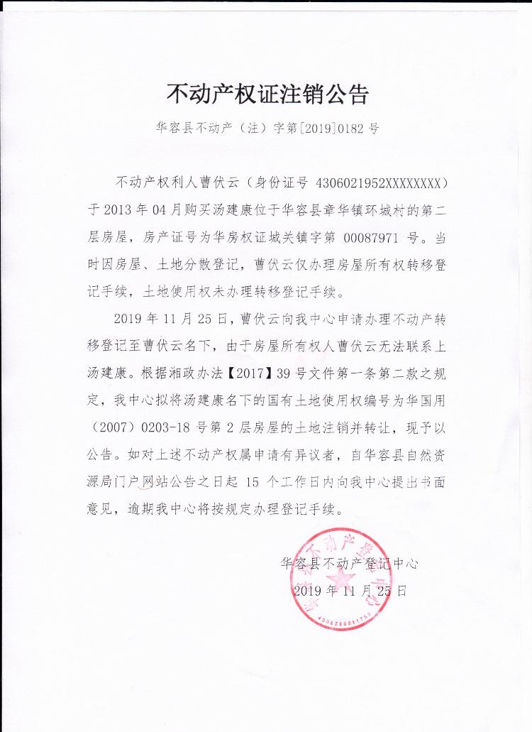 不动产权证书注销公告【土地使用权证(汤建康转曹伏云)】
