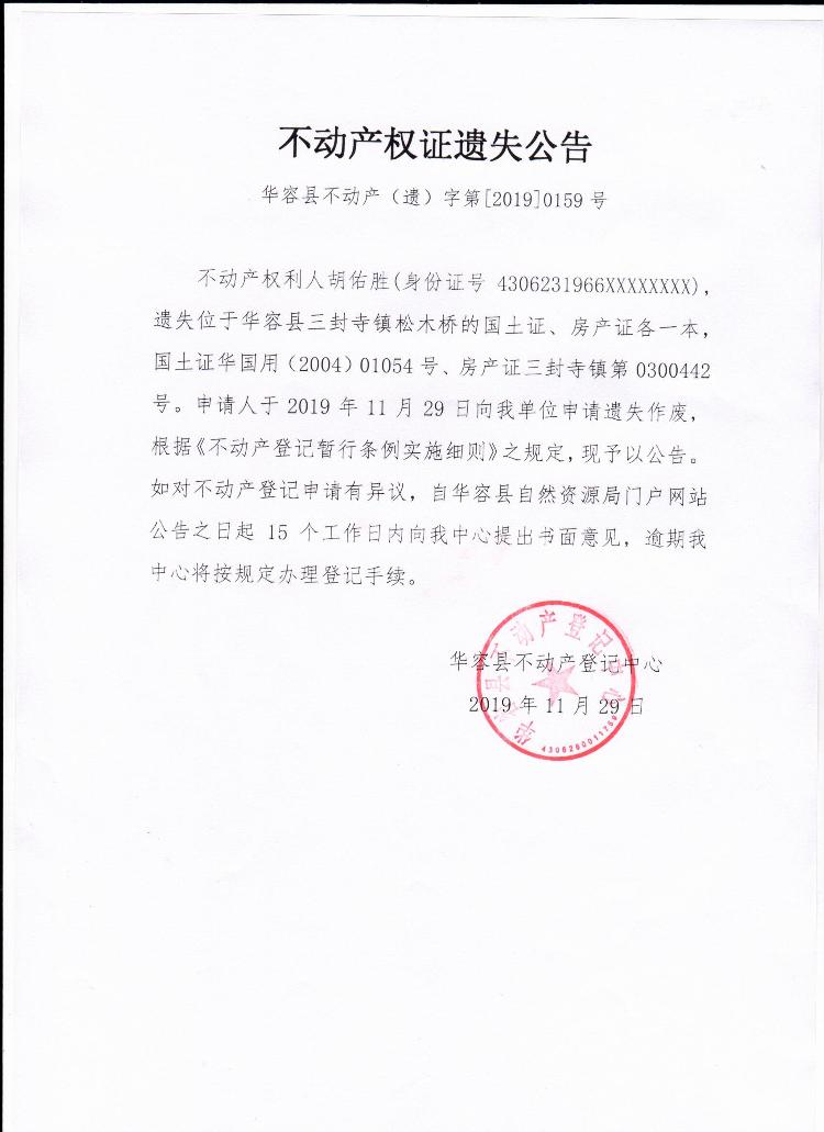 不动产权证遗失公告【国土证 房产证(胡佑胜)】