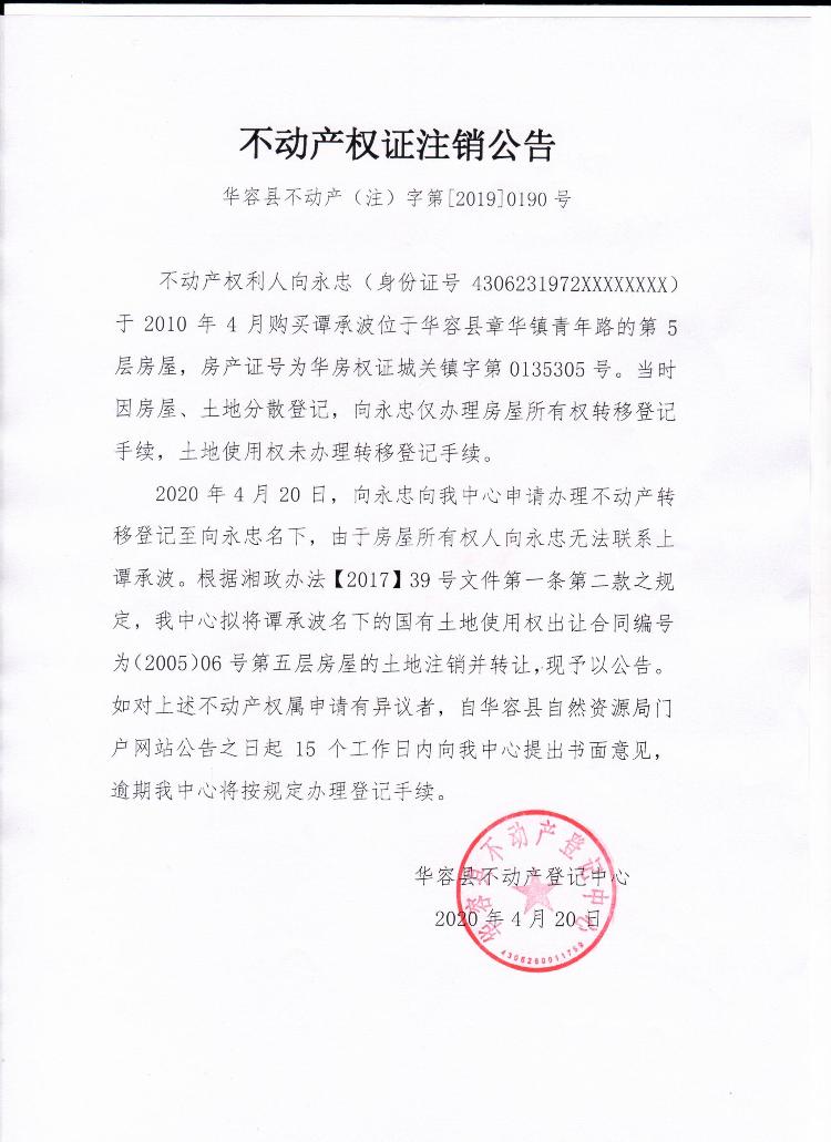 不动产权证书注销公告【土地使用权证(谭承波转向永忠)】