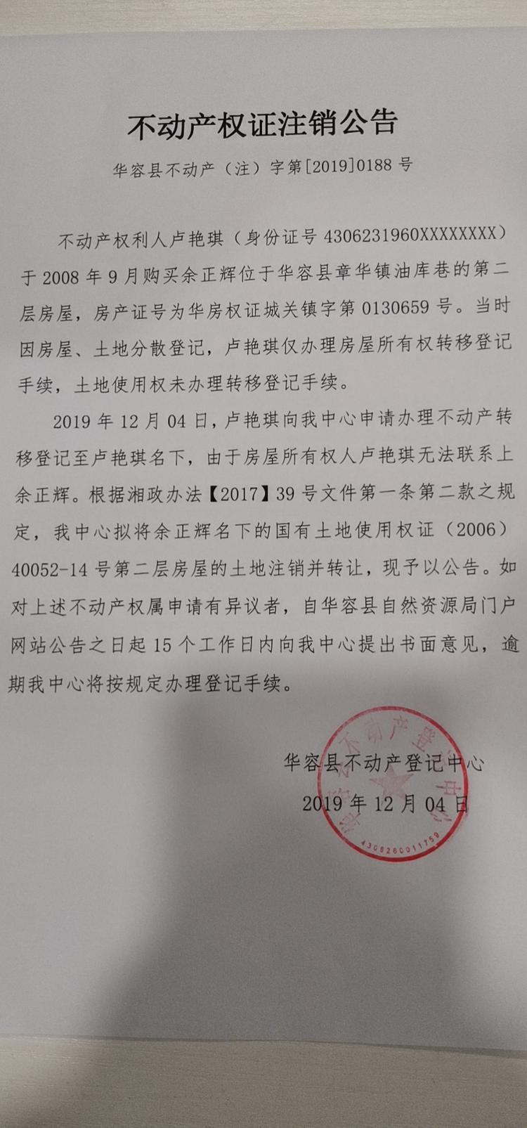 不动产权证书注销公告【土地使用权证(余正辉转卢艳琪)】