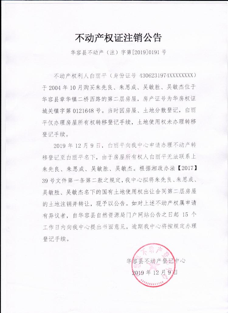 不动产权证书注销公告【土地使用权证(朱先良、朱思成、吴敏胜、吴敏杰、转白丽平)】