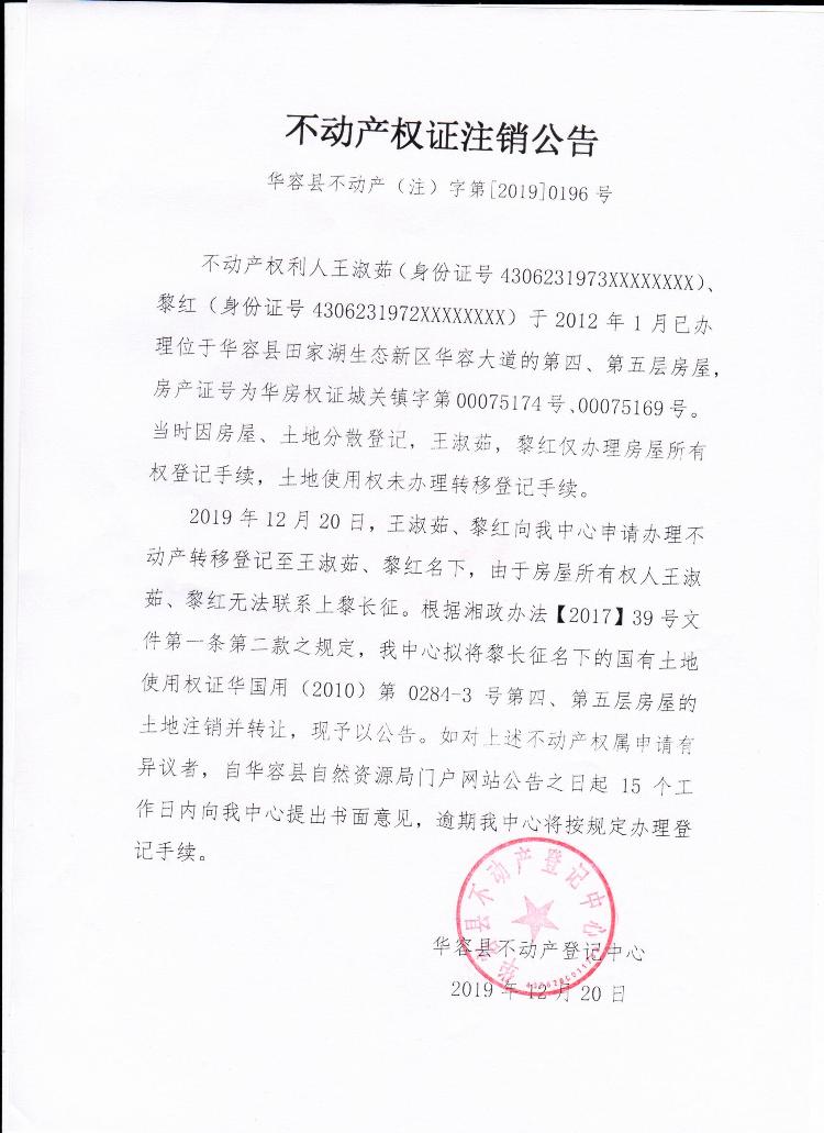不动产权证书注销公告【国有土地证(黎长征转王淑茹、黎红)】