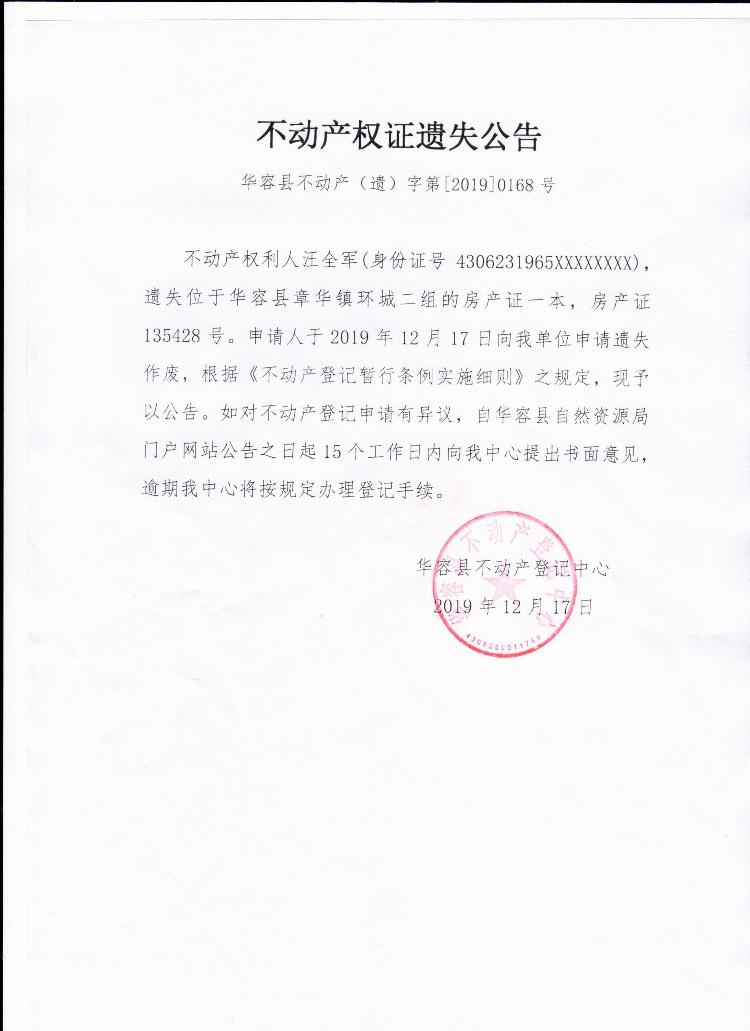 不动产权证遗失公告【房产证(汪全军)】
