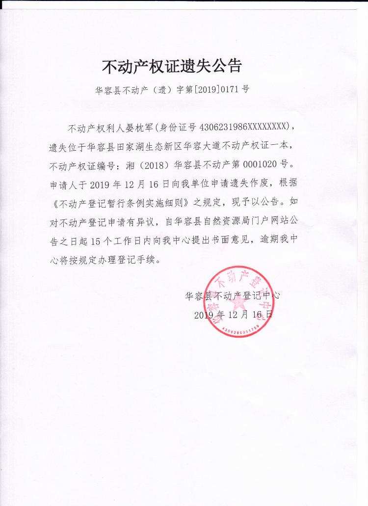 不动产权证遗失公告【不动产权证(晏枕军)】