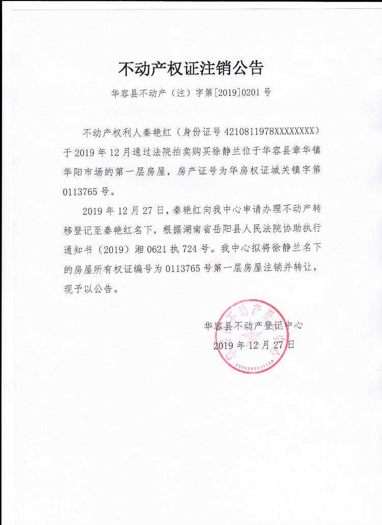 不动产权证书注销公告【房屋所有权证(徐静兰转秦艳红)】