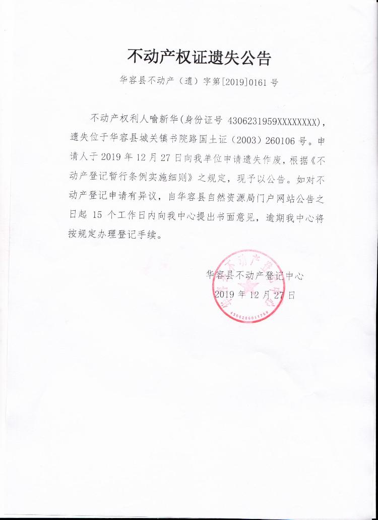 不动产权证遗失公告【国土证(喻新华)第二宗】