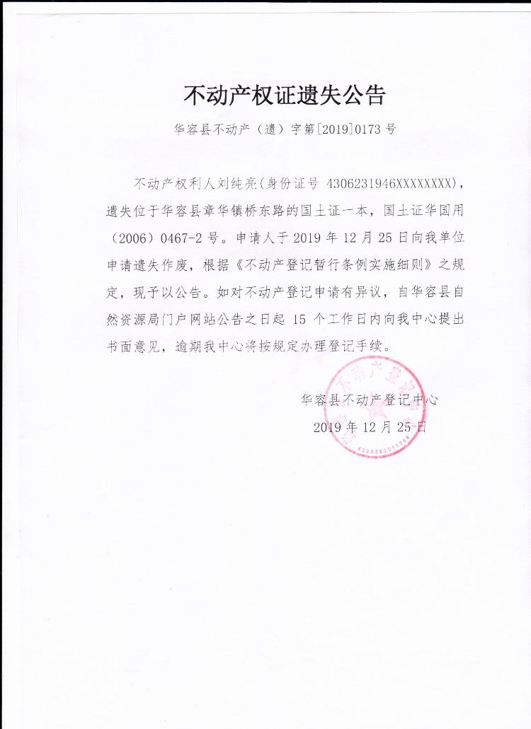 不动产权证遗失公告【国土证(刘纯亮)】