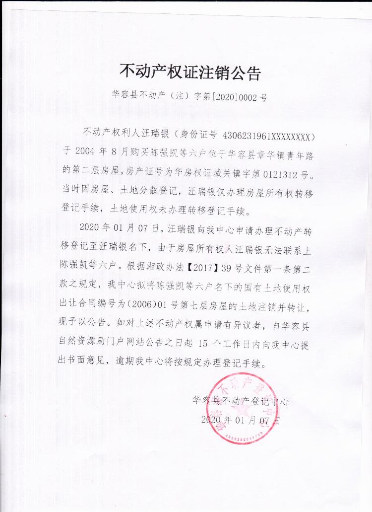 不动产权证注销公告【土地使用权证(陈强凯等六户转汪瑞银)】