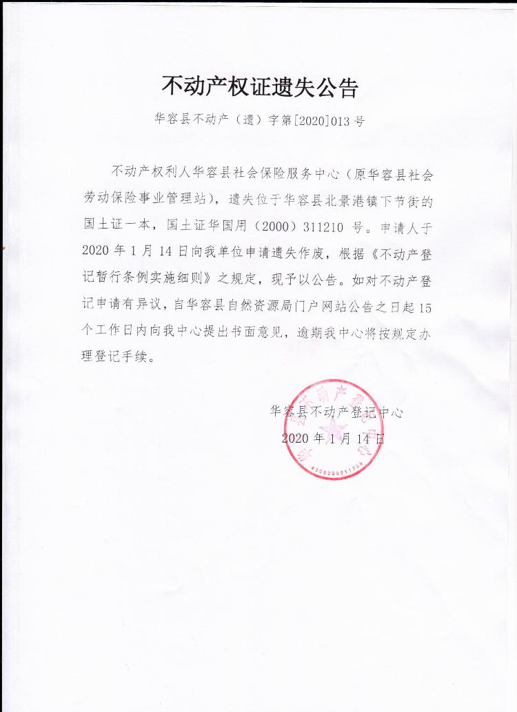 不动产权证遗失公告【国土证(华容县社会保险服务中心)(北景港镇下节街)】