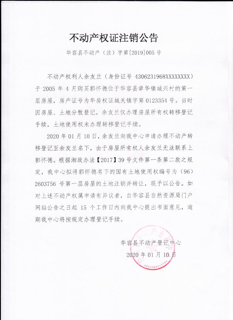 不动产权证注销公告【土地使用权证(郭怀德转余友兰)】