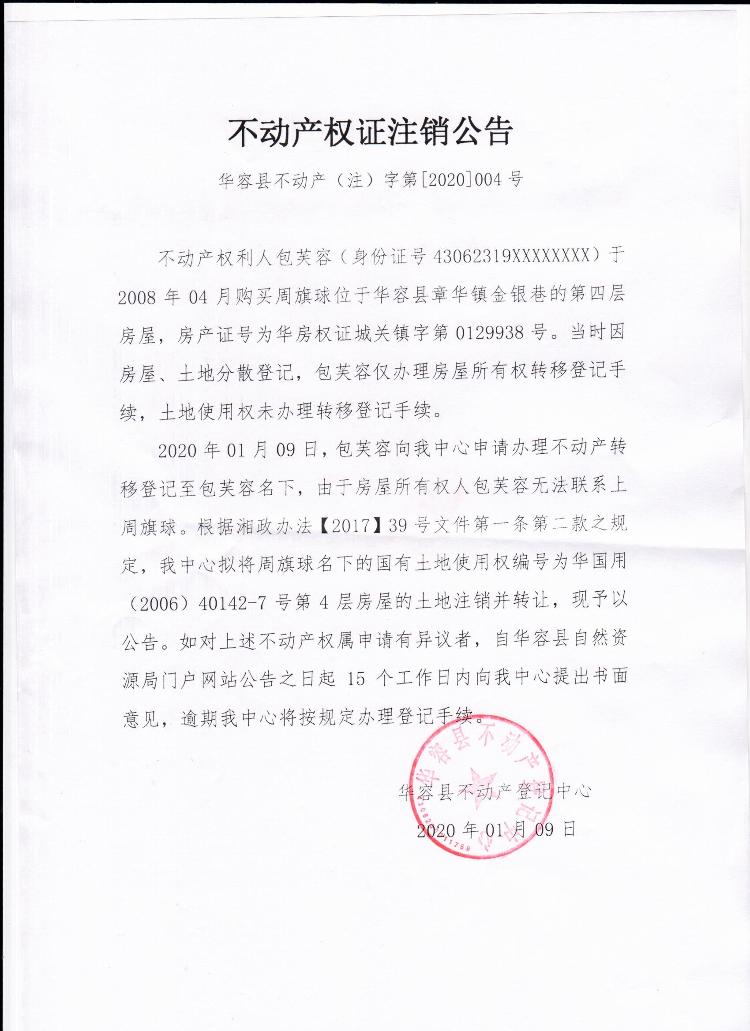 不动产权证注销公告【土地使用权证(周旗球转包芙容)】