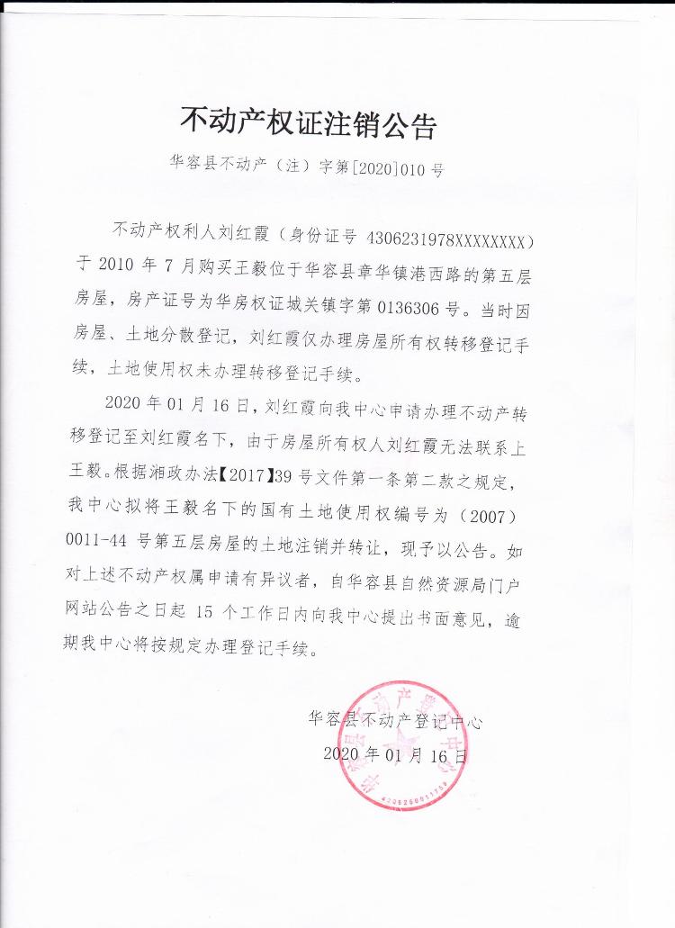 不动产权证注销公告【土地使用权证(王毅转刘红霞)】