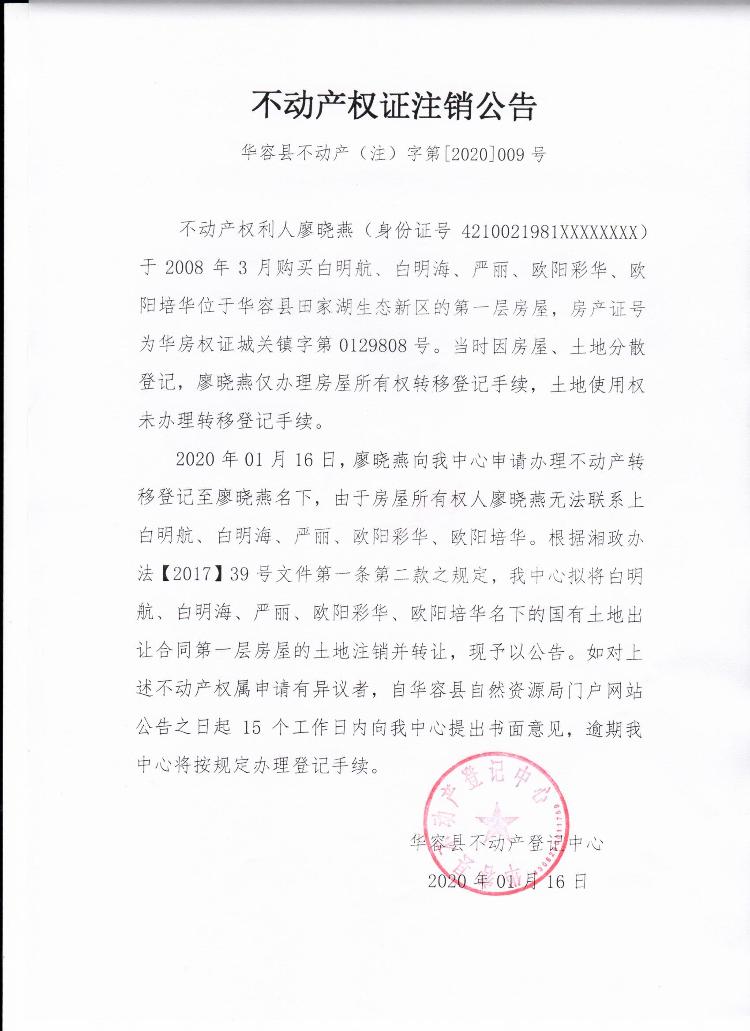不动产权证注销公告【土地使用权证(白明镜、白明海、严丽、欧阳彩华、欧阳培华转廖晓燕)】