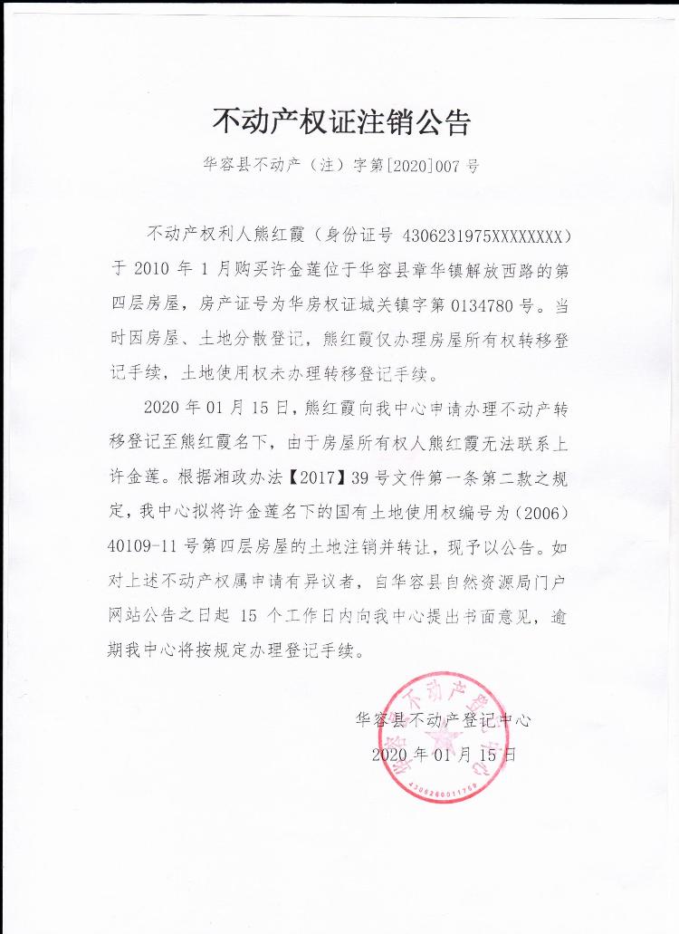 不动产权证注销公告【土地使用权证(许金莲转熊红霞)】