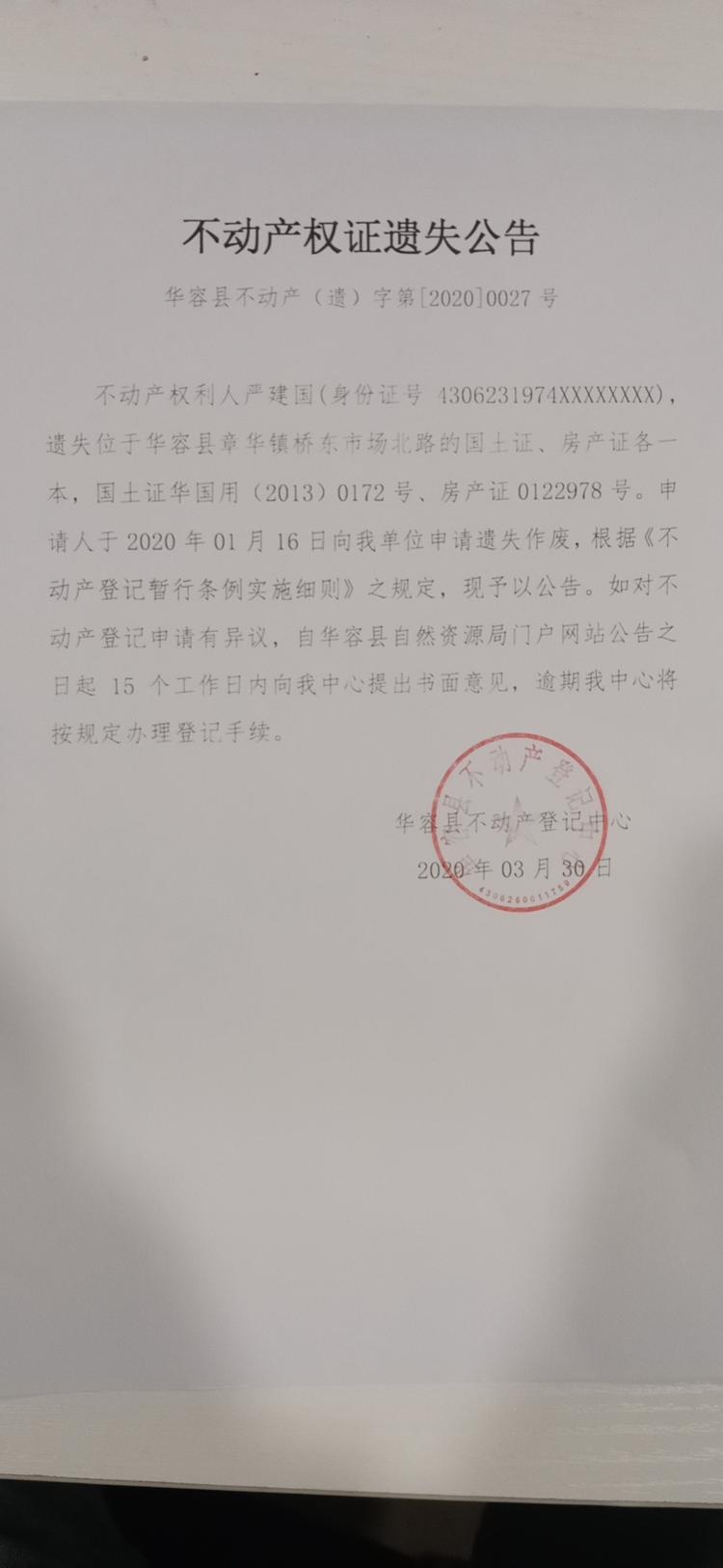 不动产权证遗失公告【国土证 房产证(严建国)】