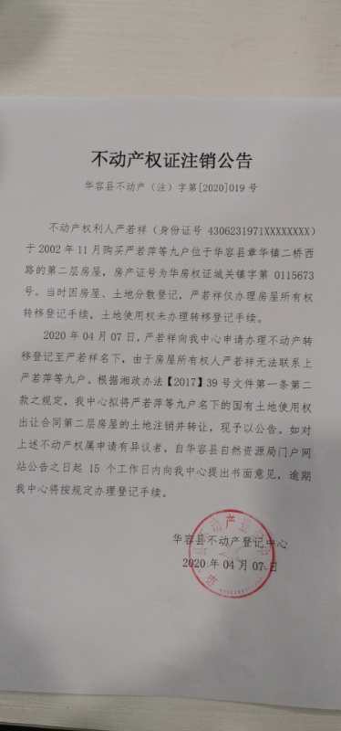 不动产权证注销公告【土地使用权证(严若萍等9户转严若祥)】