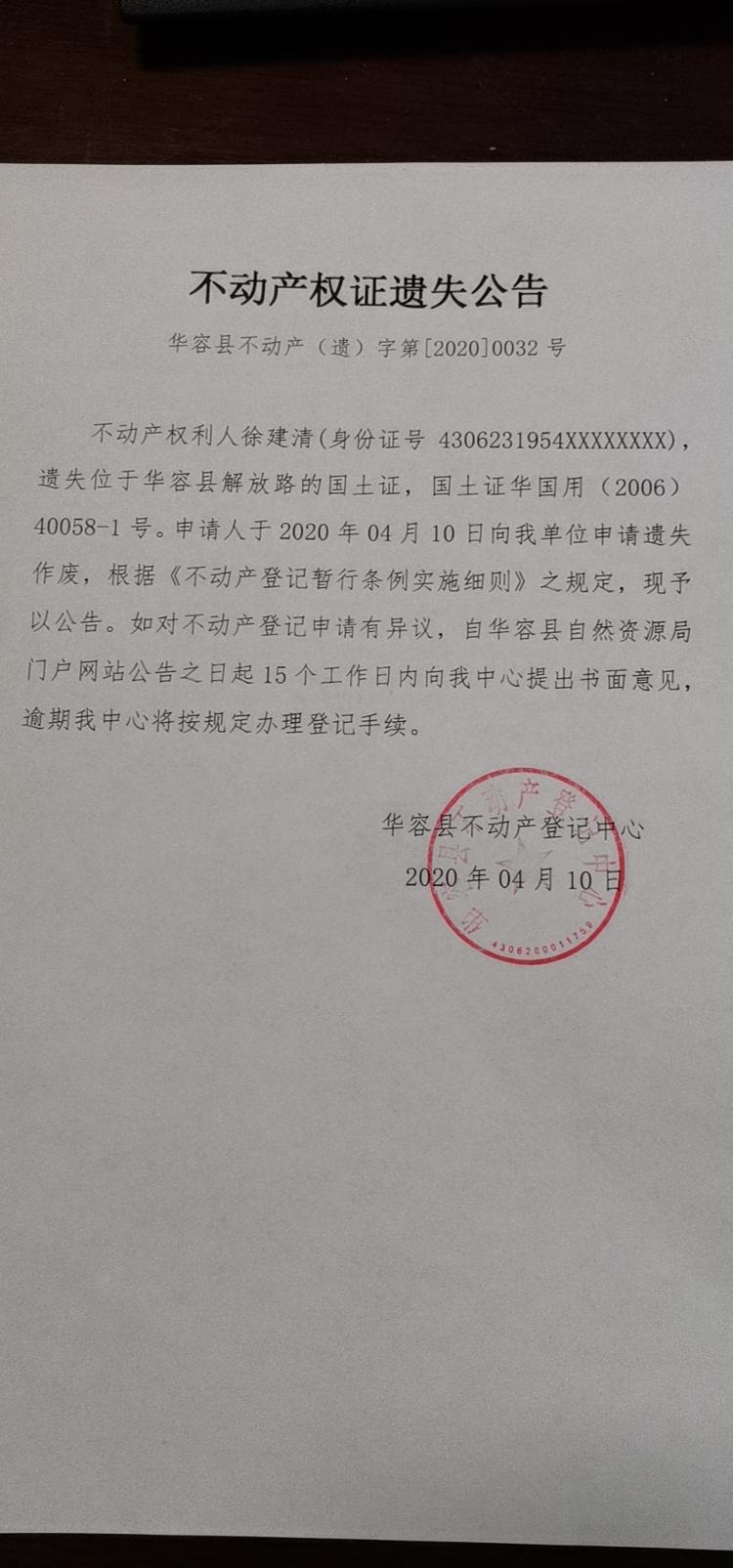 不动产权证遗失公告【国土证 房产证(徐建清)】
