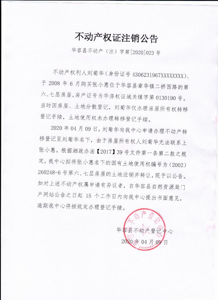 不动产权证注销公告【土地使用权证(张小惠转刘菊华)】
